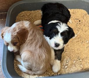 We’re thrilled to announce the arrival of our Cavapoo puppies! These lovable, hypoallergenic companions combine the sweet, affectionate nature of the Cavalier King Charles Spaniel with the intelligence and low-shedding coat of the Poodle.
